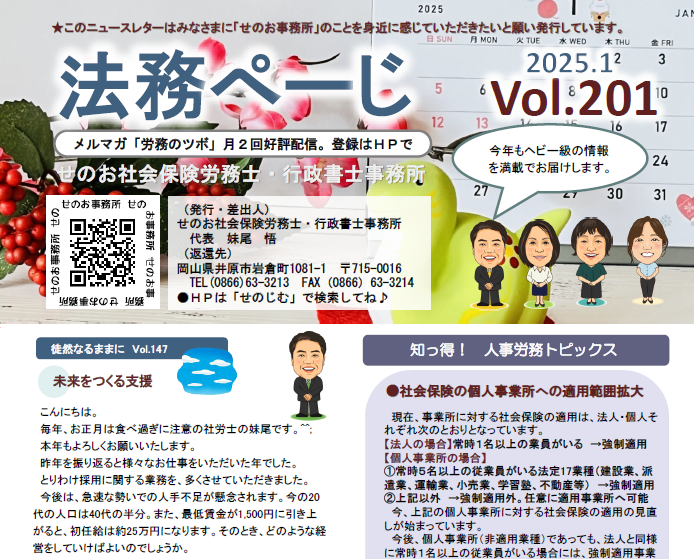 《人事労務トピックス》社会保険の個人事業所への適用範囲拡大《徒然なるままに~スタッフのつぶやき》未来をつくる支援/新年のご挨拶/今後の目標